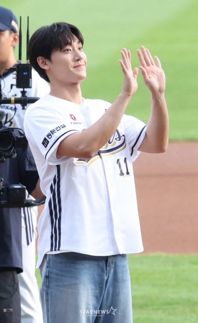 배우 이도현이 경기에 앞서 두산 승리기원 시구를 하고 있다.